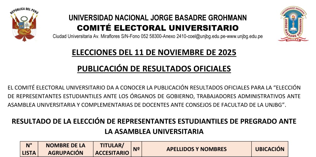 "ELECCIÓN DE REPRESENTANTES ESTUDIANTILES ANTE LOS ÓRGANOS DE GOBIERNO, TRABAJADORES ADMINISTRATIVOS ANTE ASAMBLEA UNIVERSITARIA Y COMPLEMENTARIAS DE DOCENTES ANTE CONSEJOS DE FACULTAD DE LA UNJBG"